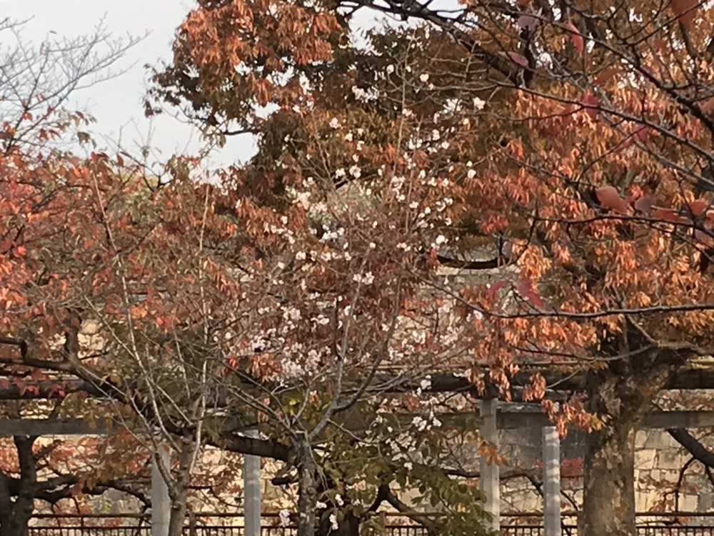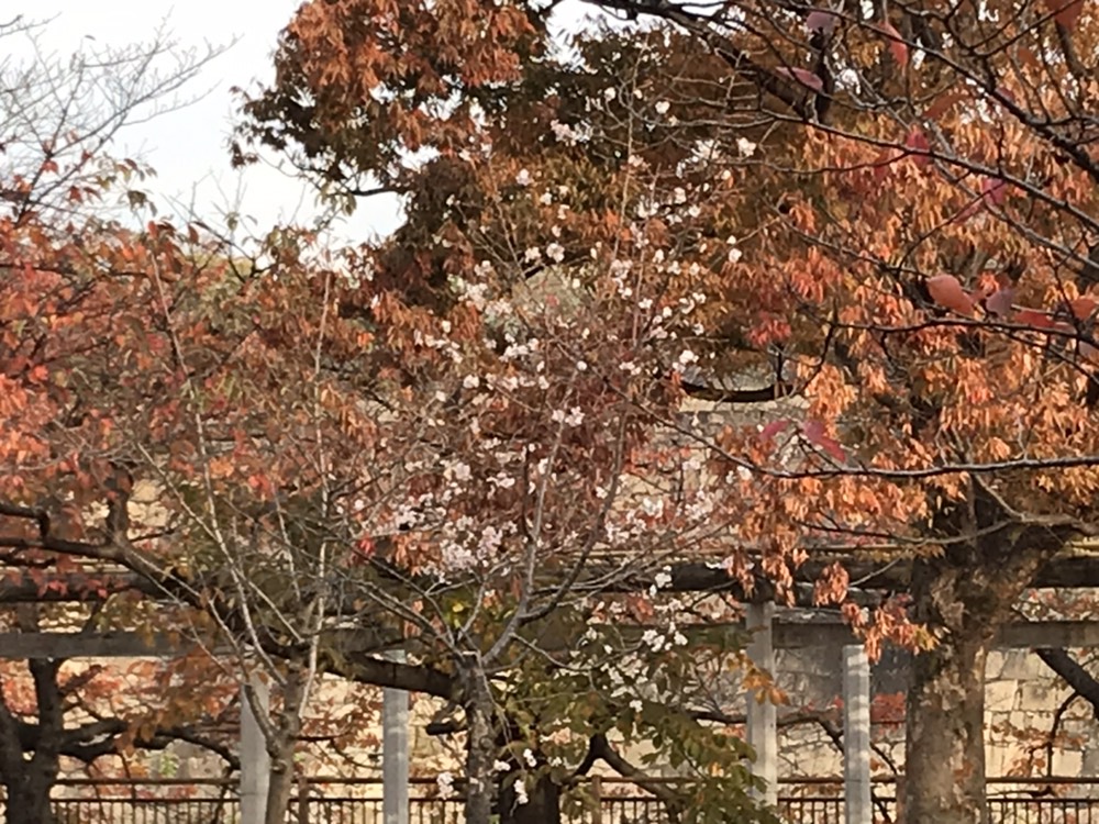 二季咲桜でしょうか。紅葉の中可憐に咲いていてとても可愛らしかったです。