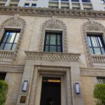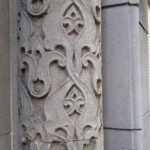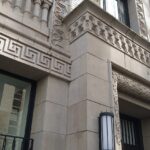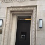 低層階の外壁のみ歴史的遺産の建築を残し、内部~高層階はマンションです。こういったやり方を「ファザード保存」と呼びます。ファザードとはフランス語で建物正面のデザインを指す語句です。以前ご紹介した大阪証券取引所のビルも同じ類の工法で建てられた建築でしたが、今回のように一般住宅として活用されてるのは大変珍しいことです(全国的にもはっきりとしたことは分からず、関西では確実にここ一件だけだそう)。これについては後ほど触れるとしまして…。