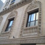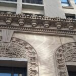 旧式の建物と新築の建築物は調和を取るのがなかなか難しいところではありまして、ファザード保存で挙げられる建築物は、悲しいかななんなら不評も多く聞く印象です。しかしこのグランサンクタス淀屋橋は、まず新築部分の色味をファザードに合わせてきていることと、外壁のアーチ型のレリーフに合わせて新築部の窓枠をすべて縦長に取っていることで、下層部のレトロな外観と絶妙にマッチしています。バルコニーにも細い柱を据えることで横長の長方形を縦割りにし、すべて縦長に見えるように徹底した工夫がなされました。