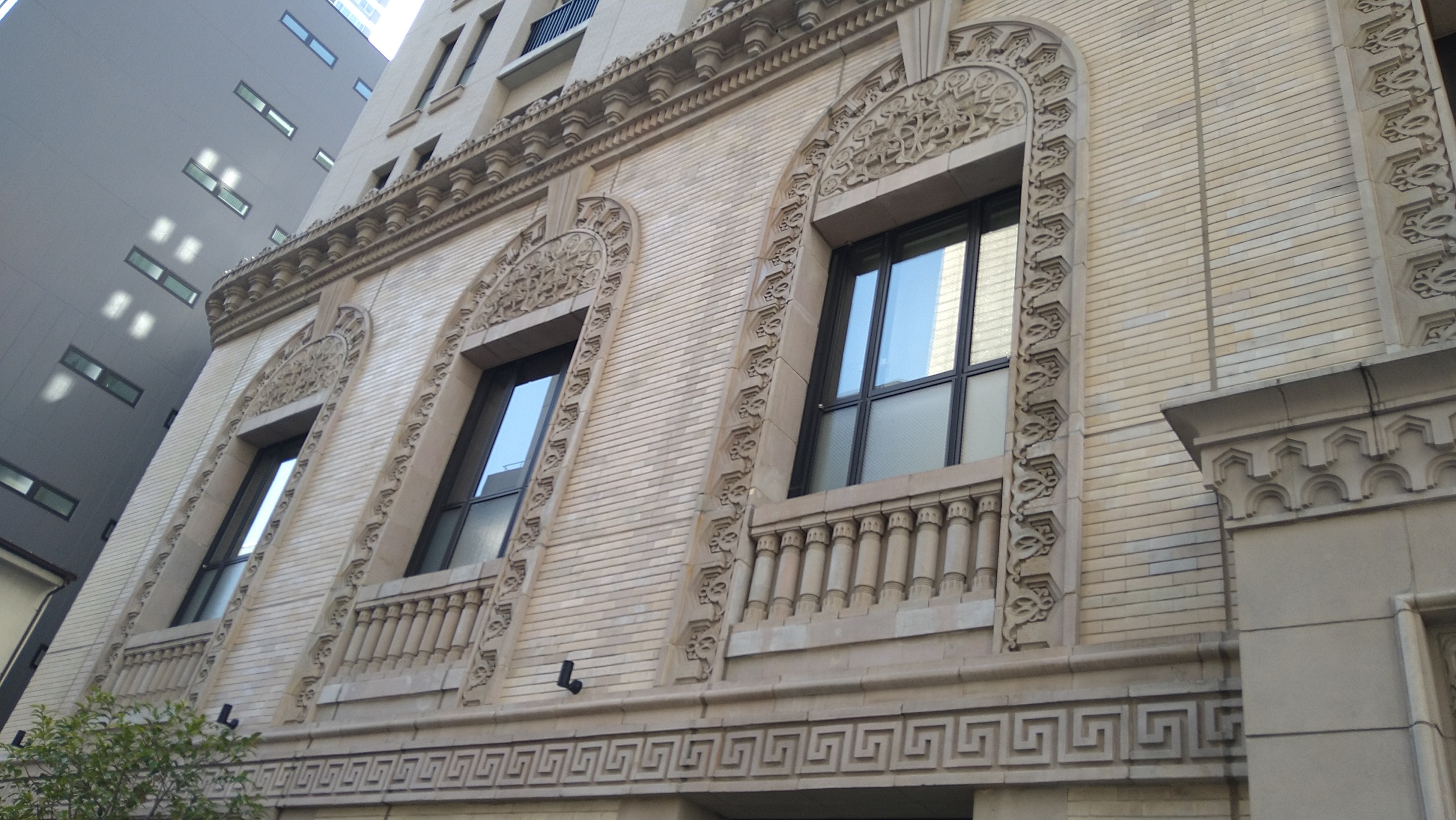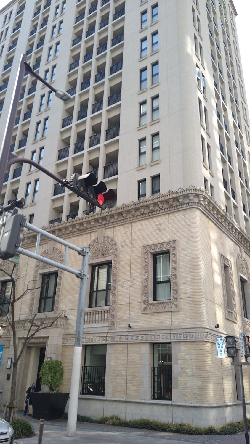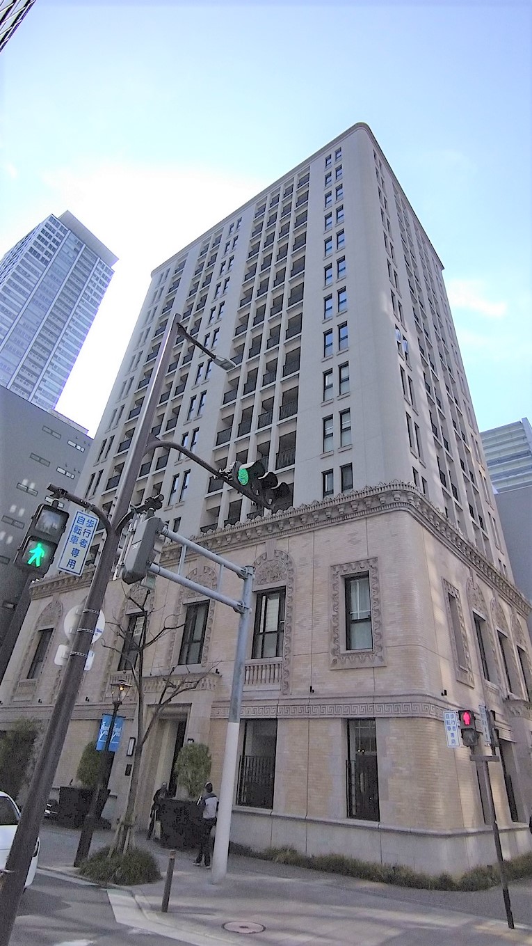 低層階の外壁のみ歴史的遺産の建築を残し、内部~高層階はマンションです。こういったやり方を「ファザード保存」と呼びます。ファザードとはフランス語で建物正面のデザインを指す語句です。以前ご紹介した大阪証券取引所のビルも同じ類の工法で建てられた建築でしたが、今回のように一般住宅として活用されてるのは大変珍しいことです(全国的にもはっきりとしたことは分からず、関西では確実にここ一件だけだそう)。これについては後ほど触れるとしまして…。