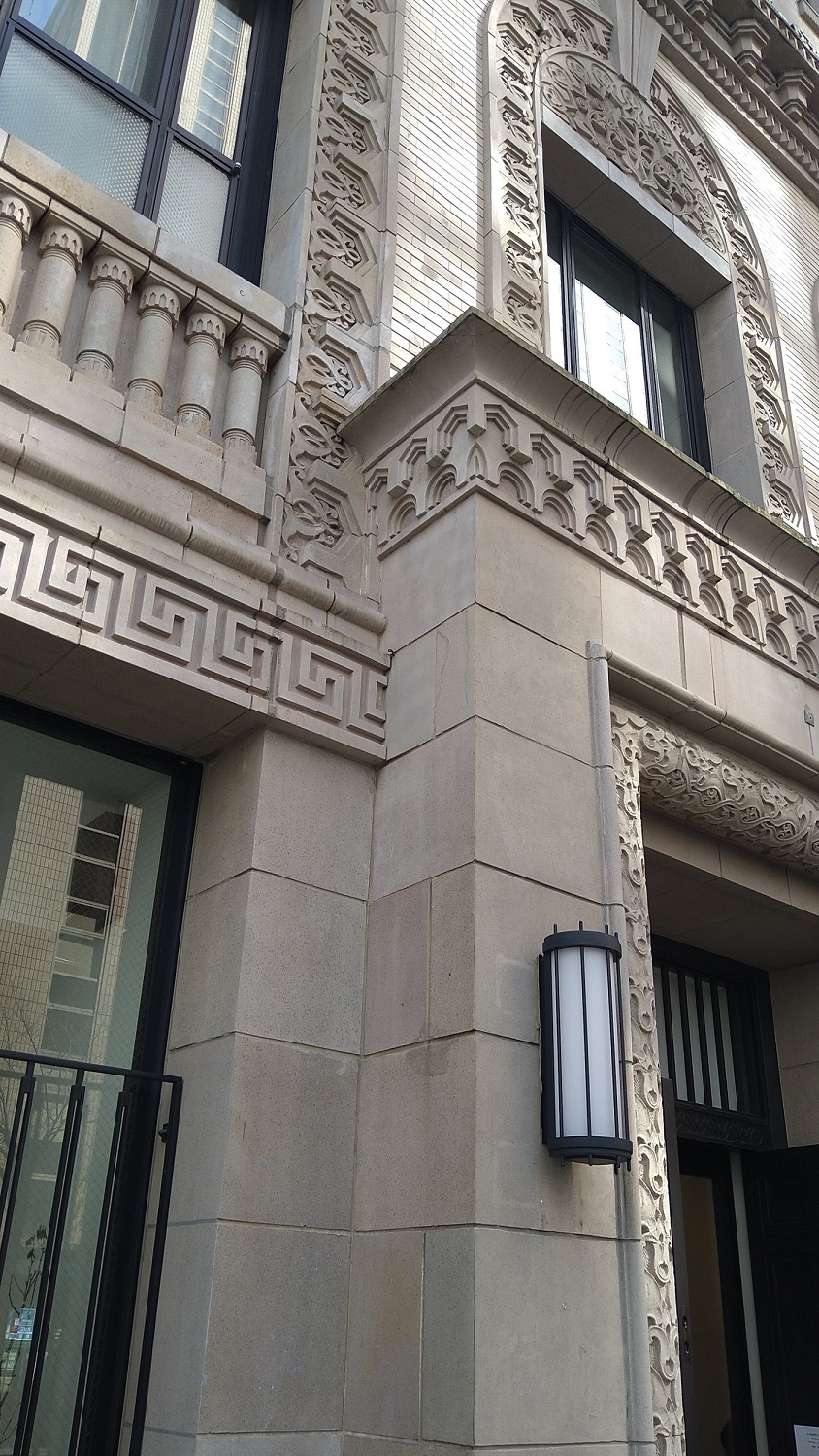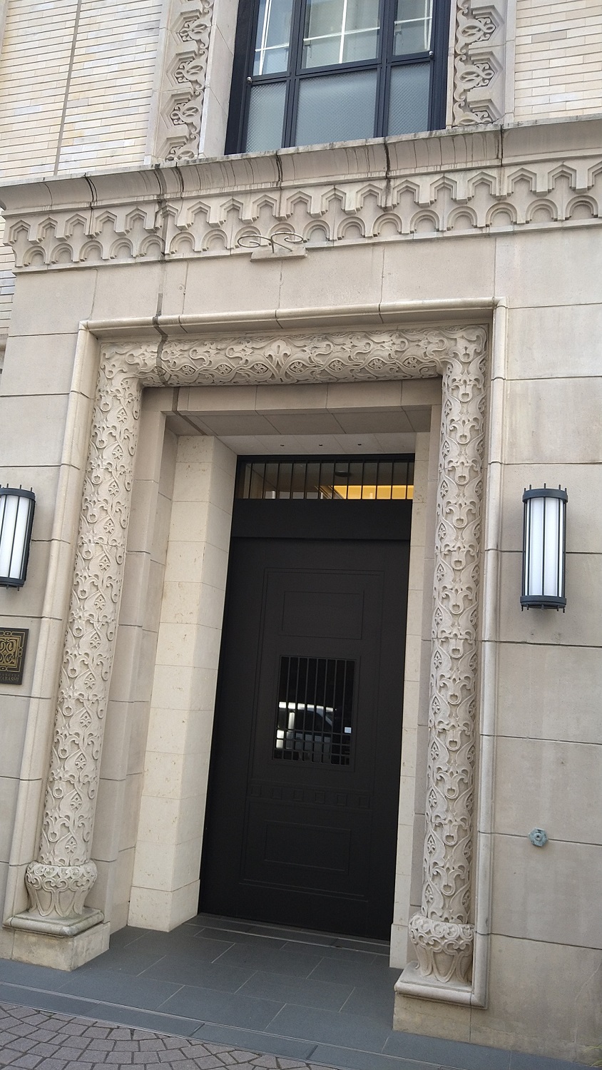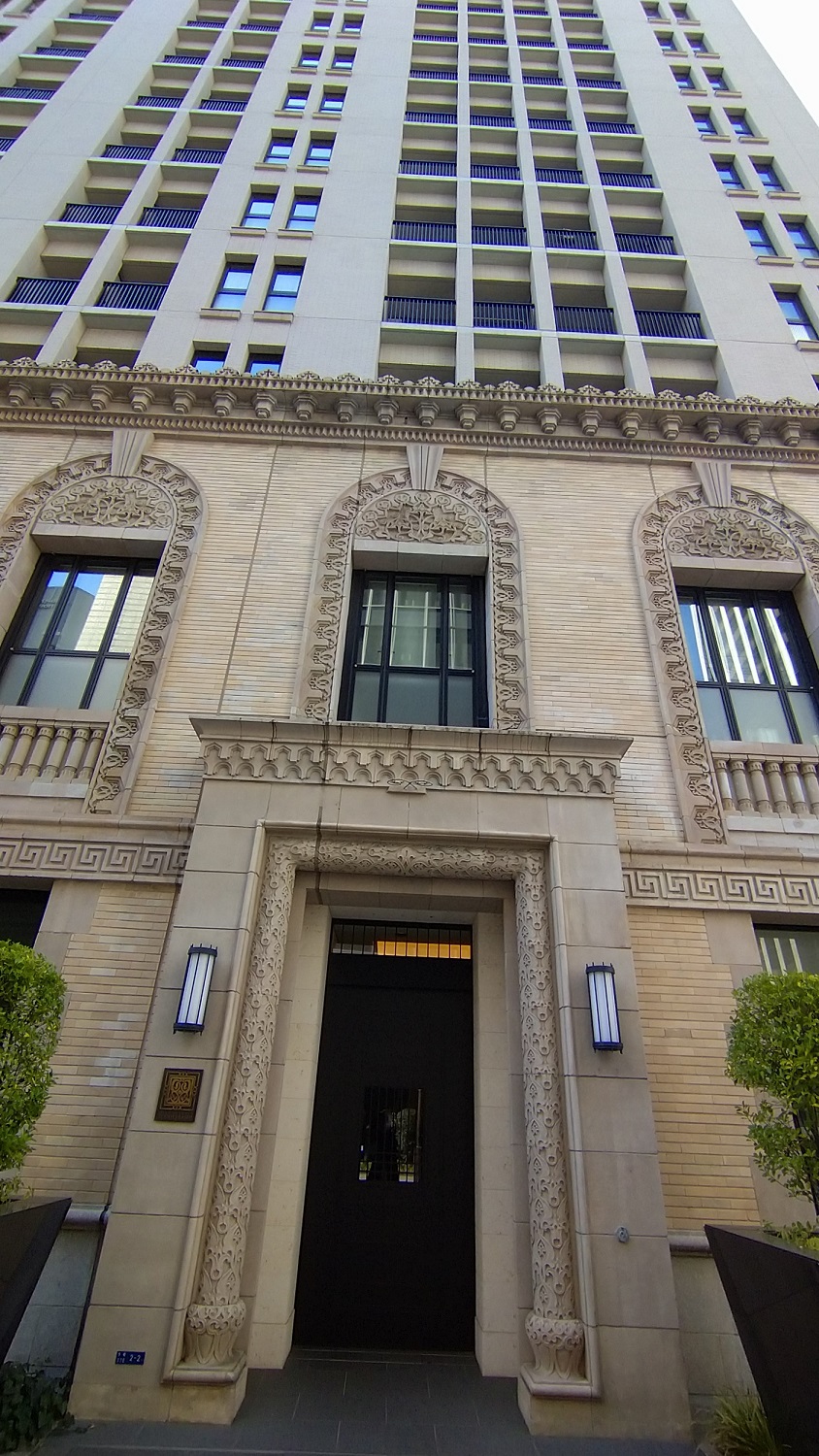 低層階の外壁のみ歴史的遺産の建築を残し、内部~高層階はマンションです。こういったやり方を「ファザード保存」と呼びます。ファザードとはフランス語で建物正面のデザインを指す語句です。以前ご紹介した大阪証券取引所のビルも同じ類の工法で建てられた建築でしたが、今回のように一般住宅として活用されてるのは大変珍しいことです(全国的にもはっきりとしたことは分からず、関西では確実にここ一件だけだそう)。これについては後ほど触れるとしまして…。