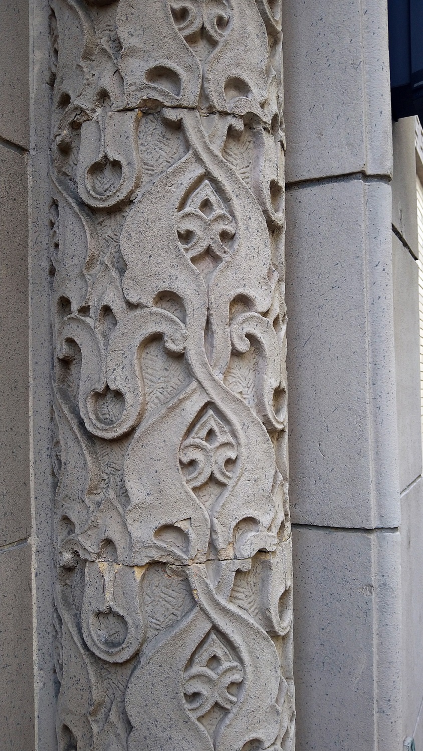 あの辰野式のシンボルが早々に取り去らわれてしまったことは、今となっては大阪建築史的にも大きな損失だったと言えるのではないでしょうか。(厳密にはこの改修時には建物の裏側だけ赤レンガが残されていたそうです)また、タイルだけでなく、アール・デコの繊細で華やかな装飾を得意とした国枝によって、窓枠などのディテールもアラベスク文様のオリエンタルな仕様に変えられました。モスクのような雰囲気でエキゾチックな美しさを放っており、辰野金吾の作品というよりは、もはや完全に国枝博の建築作品と言ってしまった方が良さそうです。