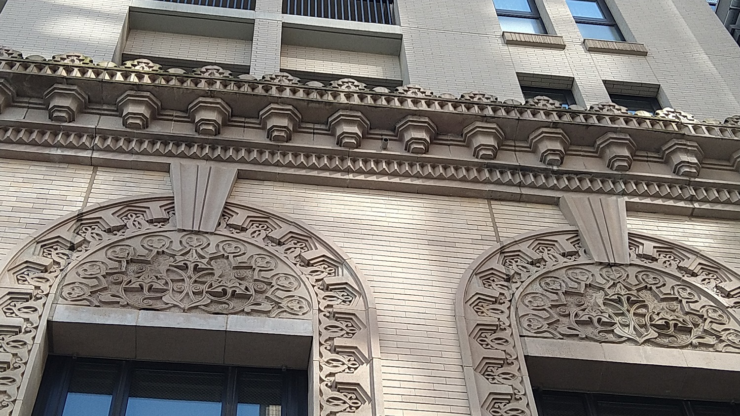 旧式の建物と新築の建築物は調和を取るのがなかなか難しいところではありまして、ファザード保存で挙げられる建築物は、悲しいかななんなら不評も多く聞く印象です。しかしこのグランサンクタス淀屋橋は、まず新築部分の色味をファザードに合わせてきていることと、外壁のアーチ型のレリーフに合わせて新築部の窓枠をすべて縦長に取っていることで、下層部のレトロな外観と絶妙にマッチしています。バルコニーにも細い柱を据えることで横長の長方形を縦割りにし、すべて縦長に見えるように徹底した工夫がなされました。