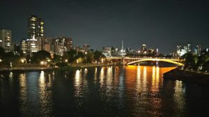 弊社のある地下鉄北浜駅から徒歩で北東へ。土佐堀通添いの葭屋橋あたりから「天神橋」を臨んだところ。