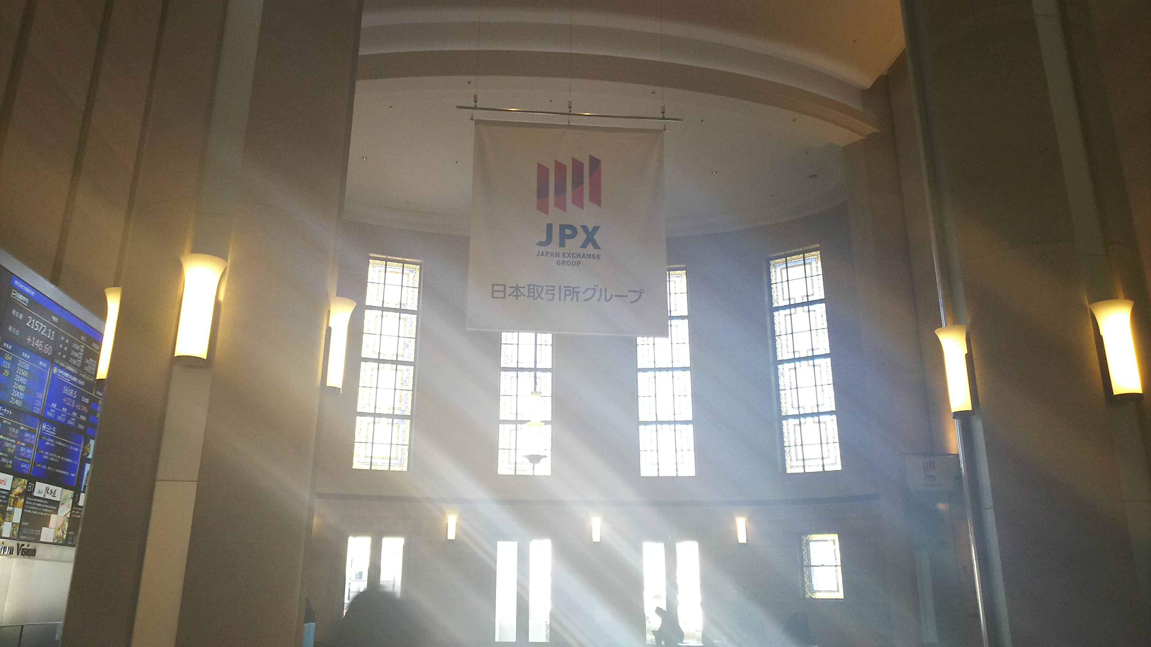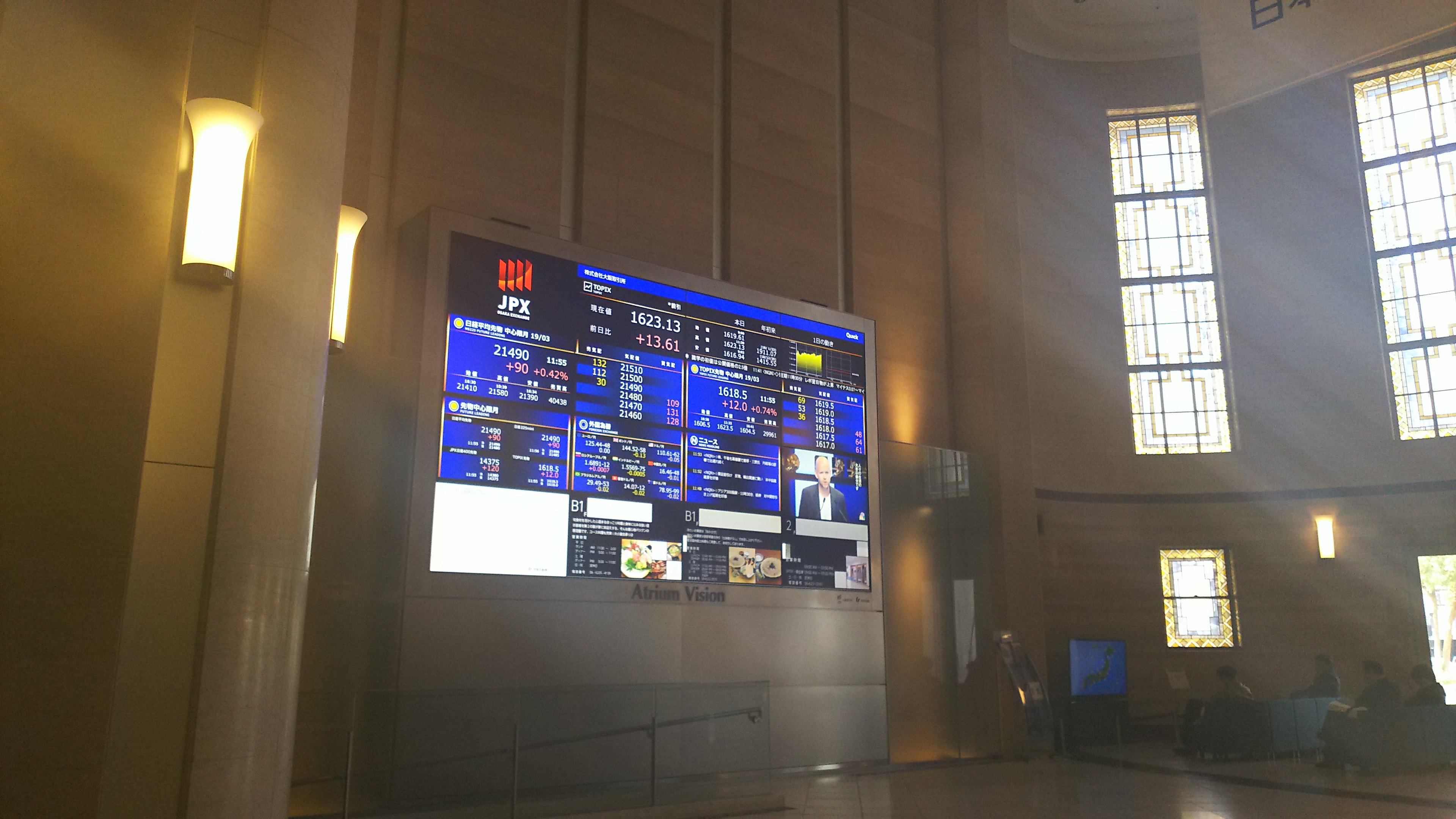 中に入ると瀟洒な窓から射す日差しが美しい、広々としたエントラスホールがあります。よく待ち合わせにも使われる場所で、証券取引所らしい大きなモニターも設置されています。