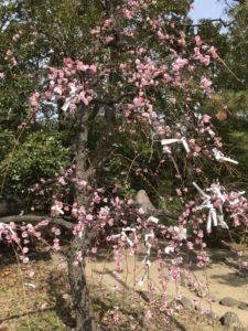 (しだれ梅にくくられているのは、近くの豊国神社のおみくじだそう。しだれた枝、しかも梅、に巻かれているのはあまり見ない光景ですよね)