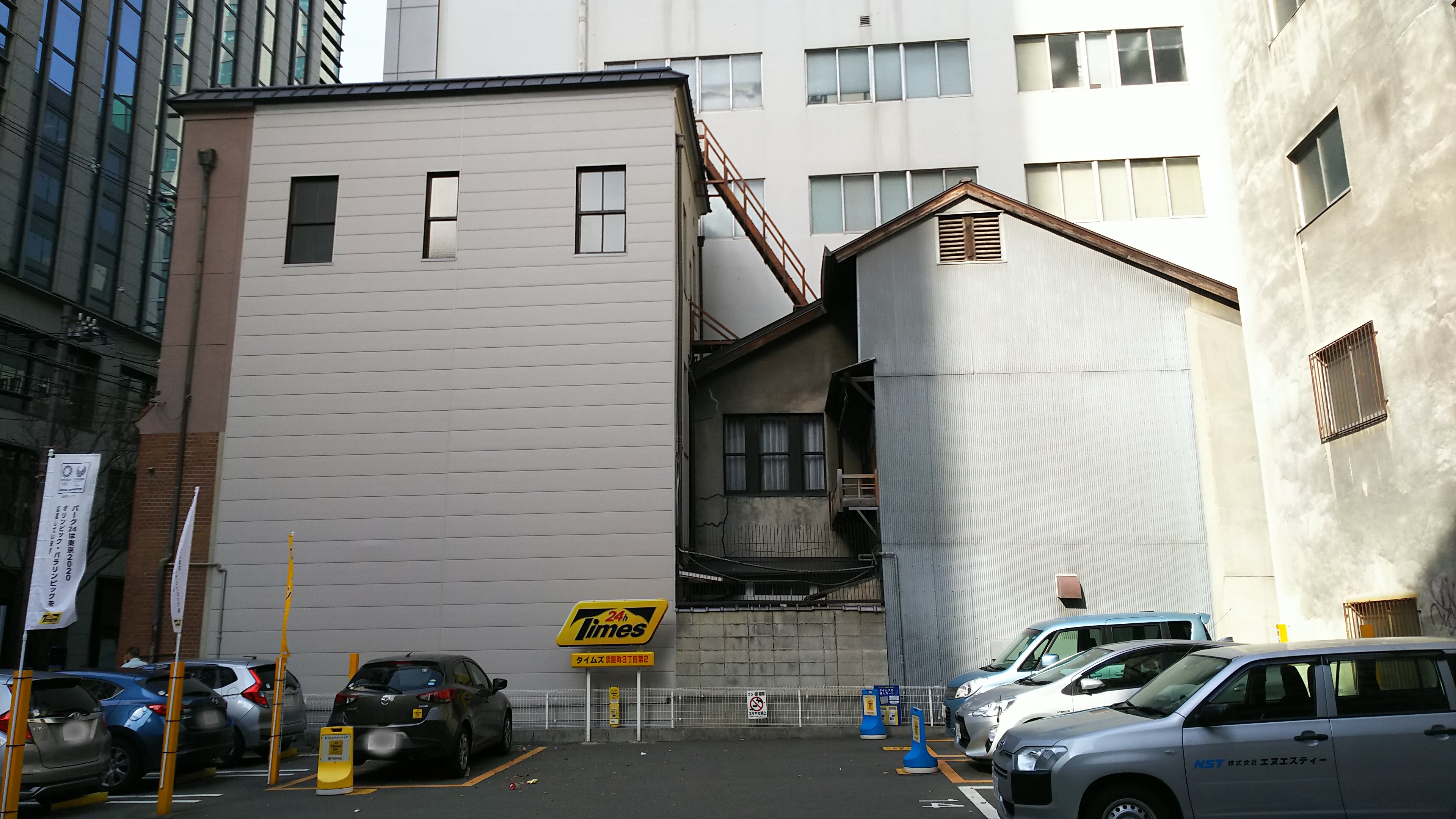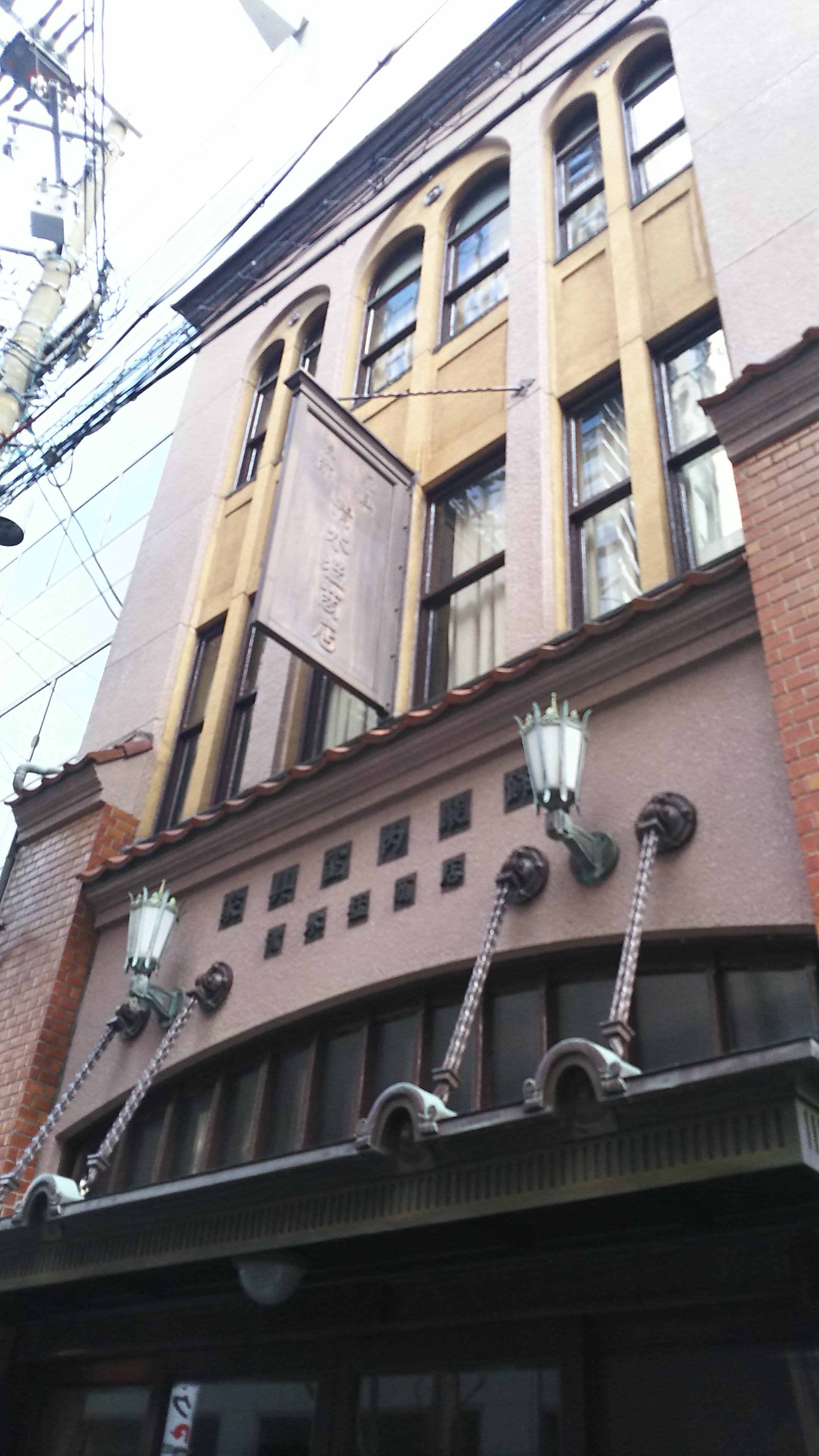 表通りから見るとタイル張りのアーチ窓。スペイン風ともとれる洋館なので、船場のほかの近代ビルと同じくRC造だろうと思いきや、調べてみますとこれはなんと木造建築。表屋造りという、太閤秀吉の時代の間口銭対策で立てられた鰻の寝床の発展形です。さいわいお隣が駐車場になっており見通しが良くなっているので、横側に回って造りを確認することができます。