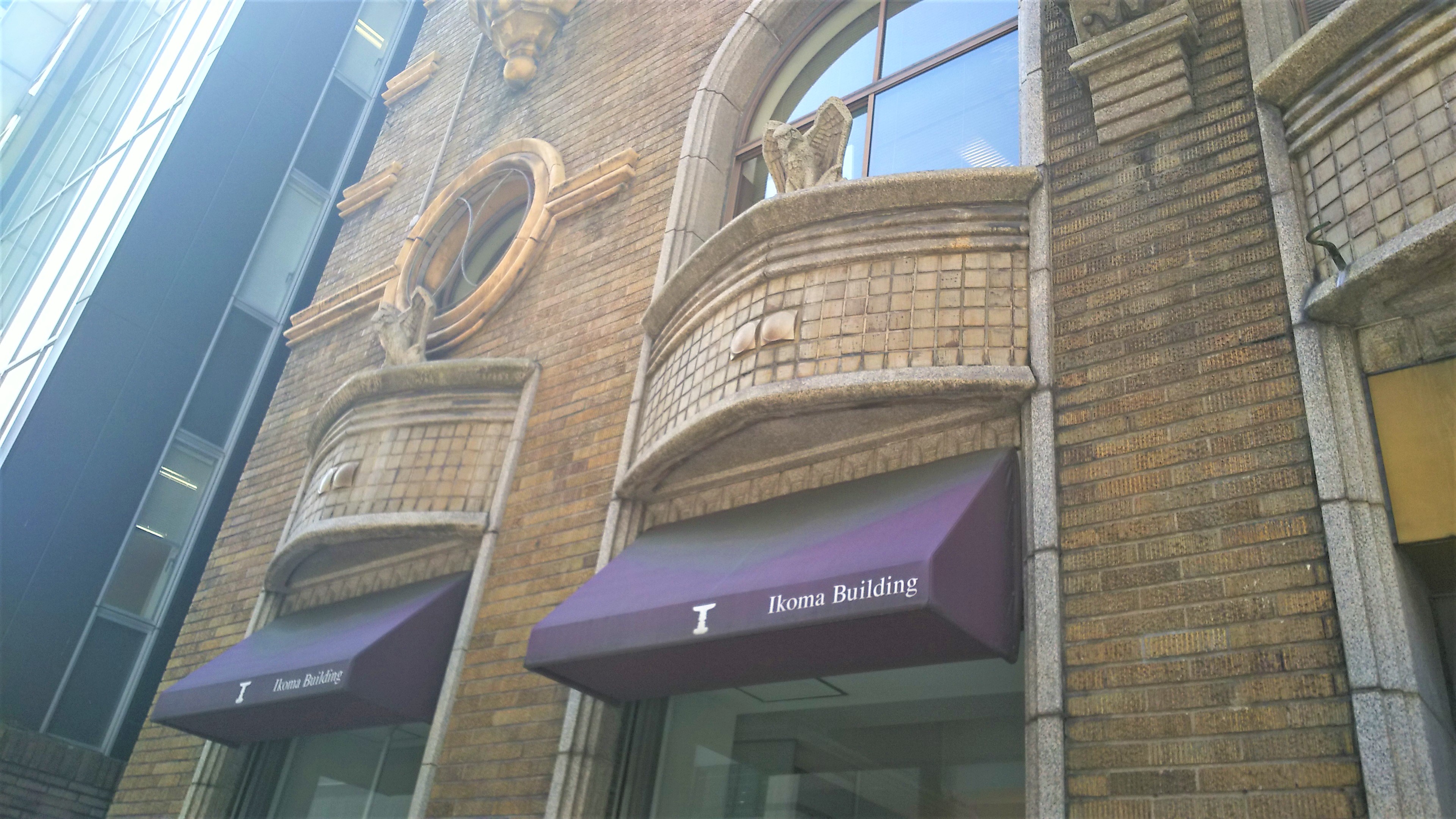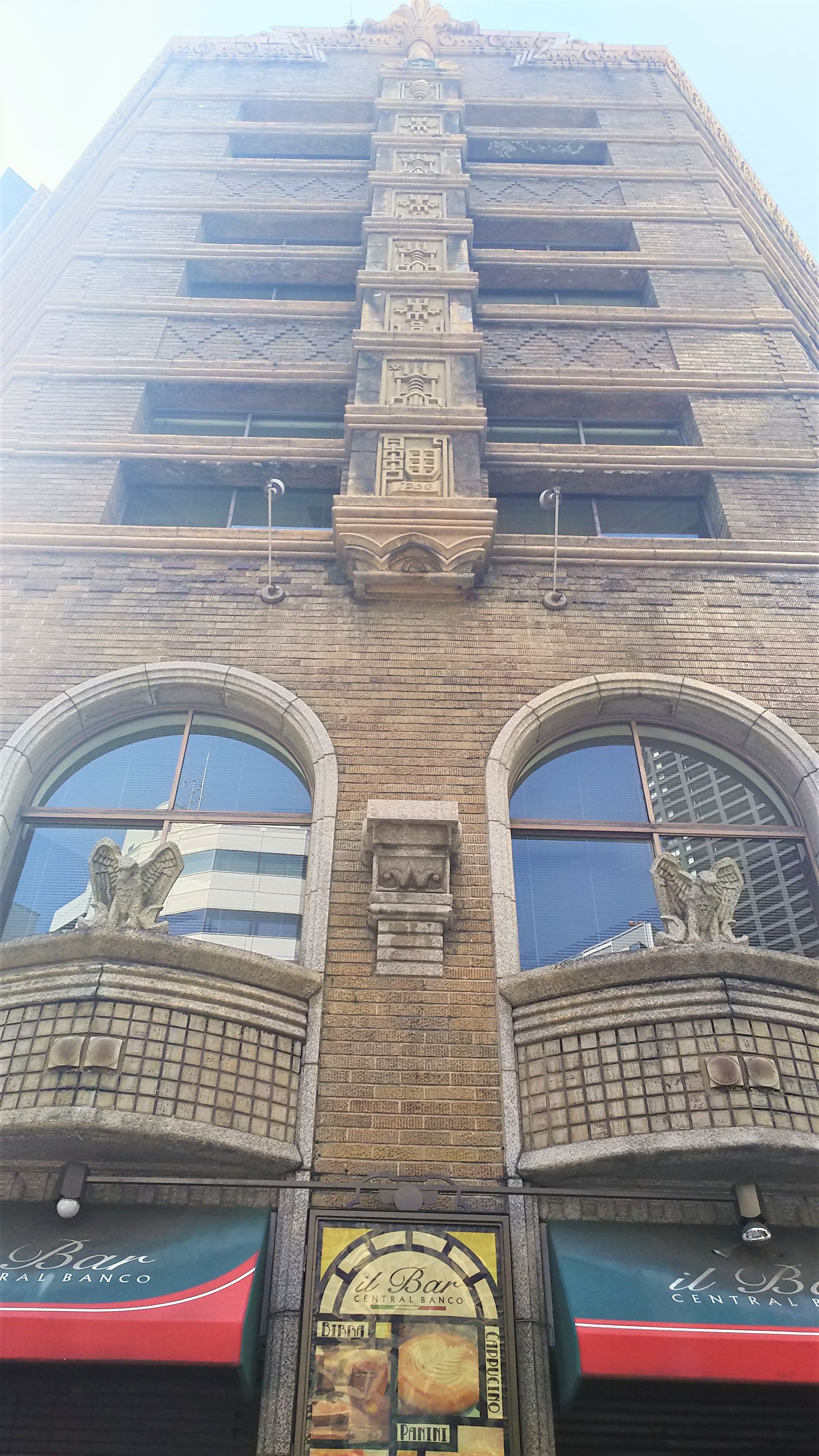 大理石やステンドグラスがあしらわれ、手描きの縦縞模様のスクラッチタイルが洒落たアクセントになっているアールデコ建築です。時計を模したという丸窓も可愛らしく、窓に設えられたのはガーゴイルかと思っていましたが、調べてみると鷲を象ったもののようでした。確かによく見るとその通り。立ち止まって目を凝らしているのを道行く人に怪訝な目で見られてしまいました。