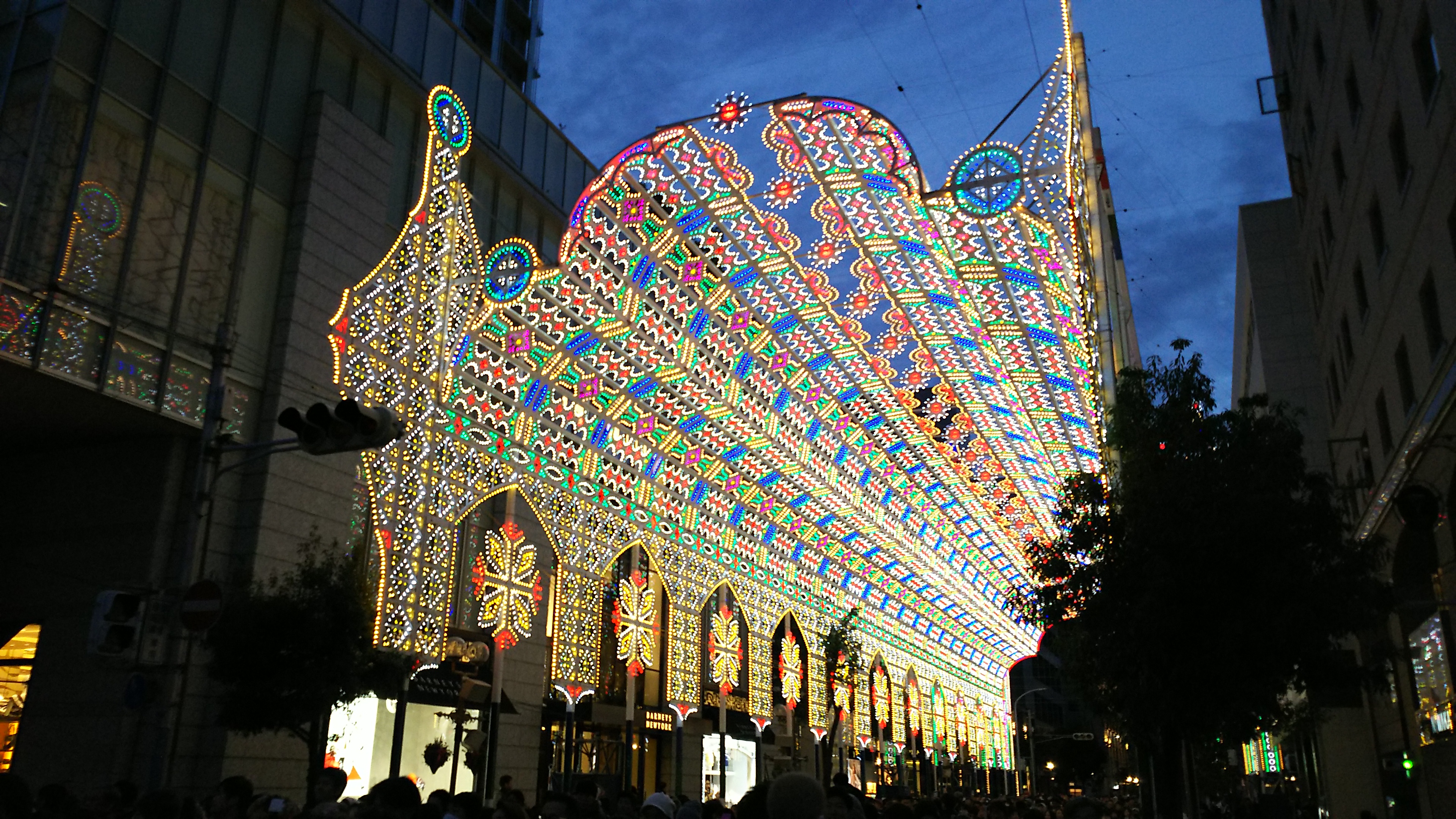 私は横の歩道をルミナリエの流れとは逆、駅の方に歩きながら景観のおこぼれに預かっただけなのですが、この光のアーチの下を潜り抜けようとするととんでもない順番待ちが…。