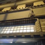写真二枚目で確認できる通り、上下階を繋ぐ壁が前傾したデザインになっており、それに伴い陶器瓦の庇もすべて歪曲しています。これはドイツ表現主義で知られるエーリッヒ=メンデルスゾーンが1923年に設計を手掛けた、ベルリンの新聞社屋などにみられる特徴のひとつ。ドイツで最先端だった建築様式がわずか4年で日本の大阪まで伝わって来ていたというのが驚きです。