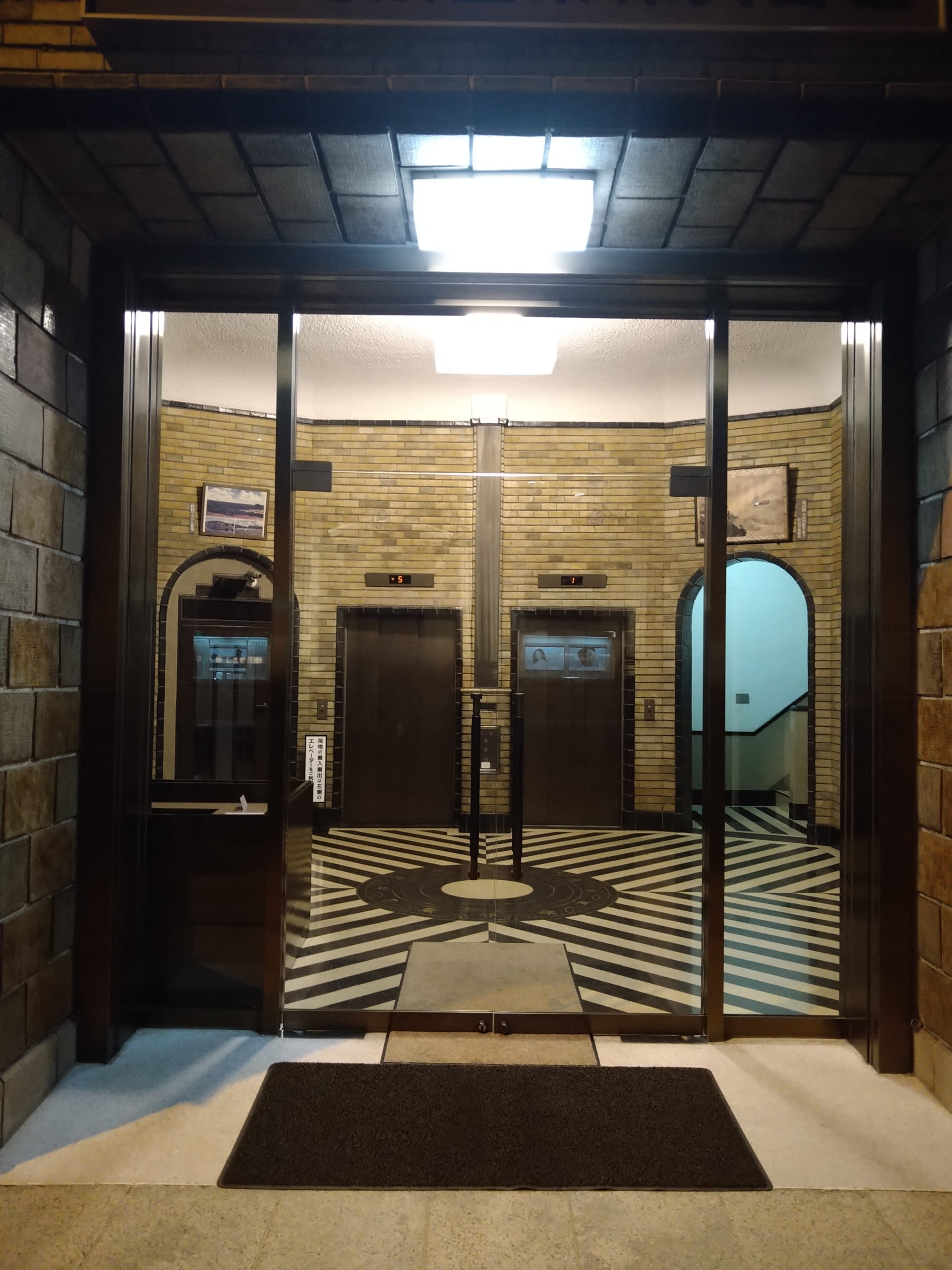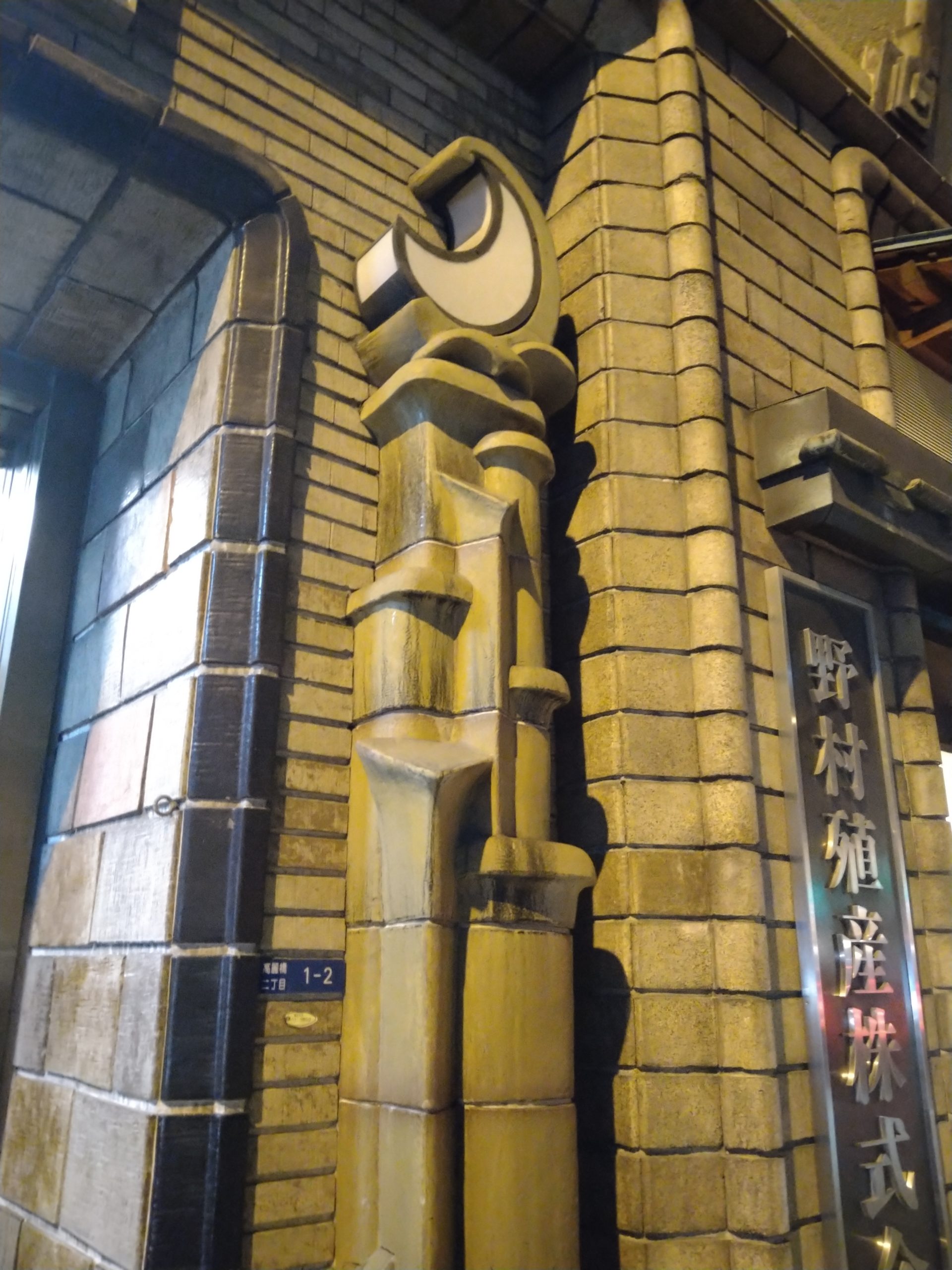 一見して三日月がモチーフなのは分かりましたが、その下は何なのだろう?と調べてみたところ、これは竹なのだそう。なるほど…。この変わった彫刻はイスラム風とのことですが、たしかに砂漠の宮殿も想起させるようなデザインです。この手のレトロビルに多く見られるのは西洋風のアレンジですが、それらとは一線を画すオリエンタルな雰囲気を醸すこの野村ビルヂング。竹で和のテイストを出しているといったところでしょうか。そのほかにも和風な雰囲気はそこかしこで感じられます。