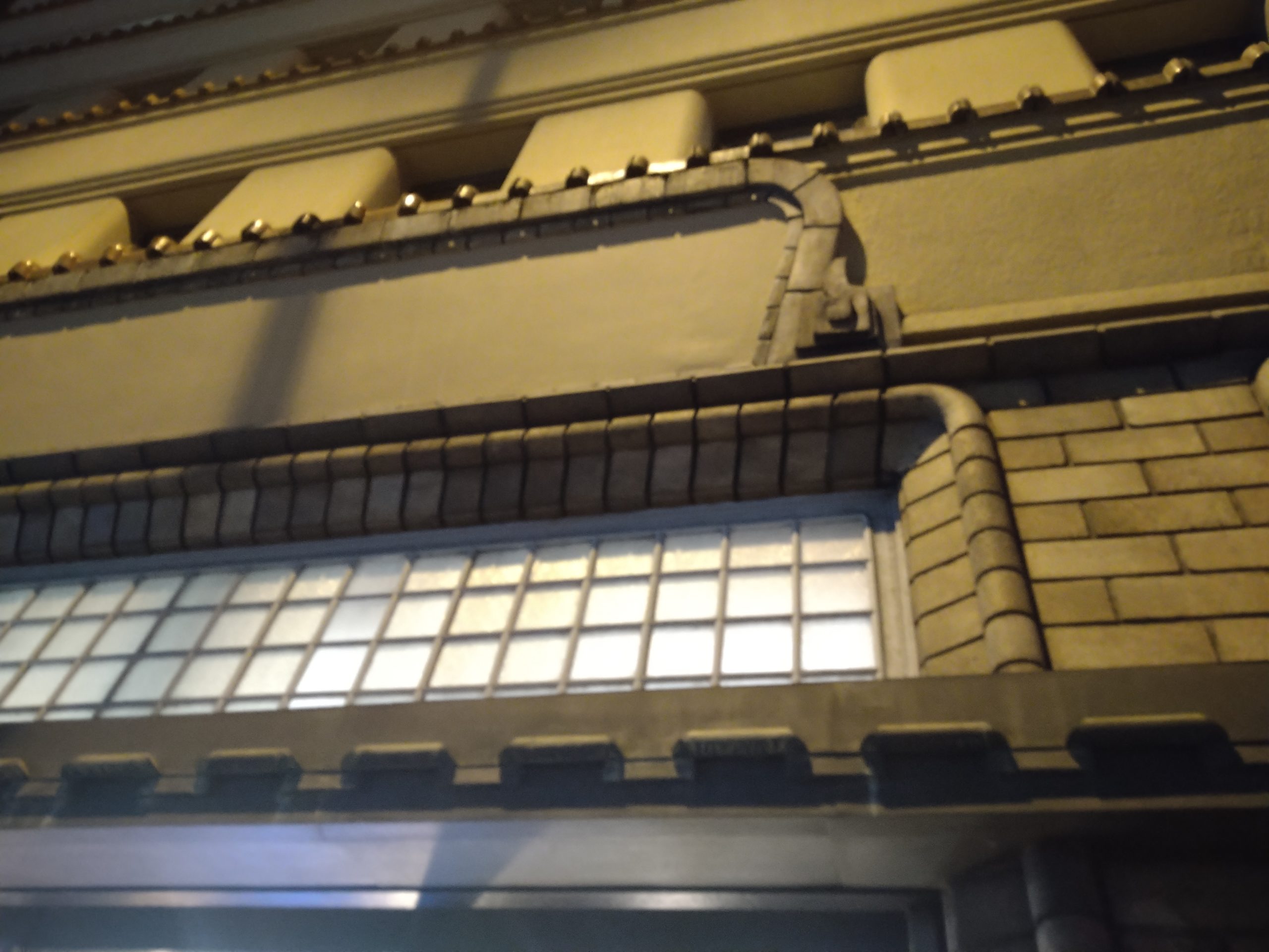 まず外壁の色はモルタル塗装された、土壁を思わせる濃い黄土色。(一階の壁面は凝灰石とタイルで装飾されています。)さらに写真三枚目、一階の上部にある採光窓は障子を思わせるデザインです。先述の瓦と土壁と合わさって、日本家屋の趣も色濃く反映されています。